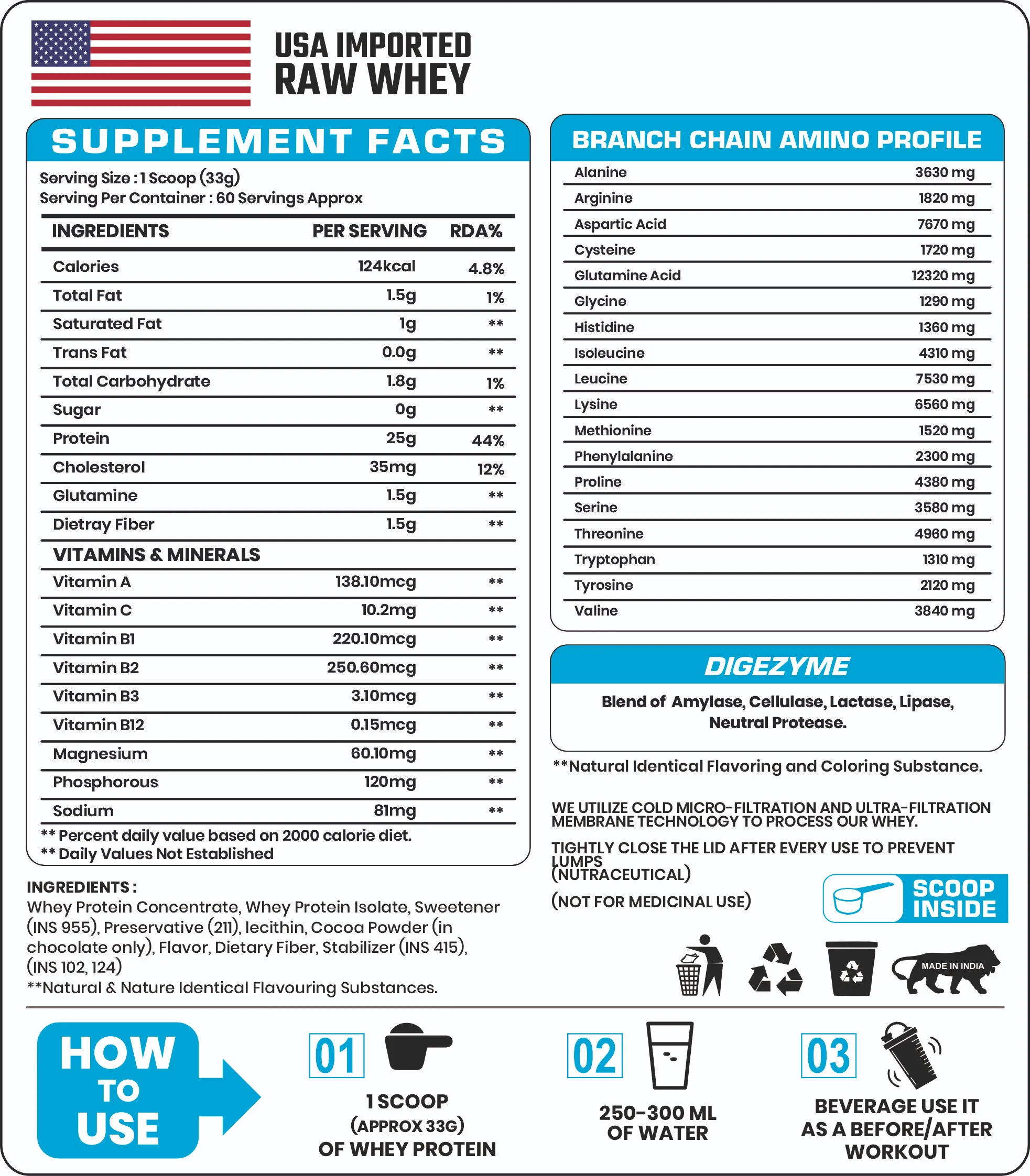 Whey Protein Concentrate, whey protein isolate, Cocoa Powder, sweetener (INS 955, INS 950), thickener (INS415), emulsifier (INS322), coffee powder, Digezyme. Digezyme-A multi-enzyme blend containing amylase, protease, lactase, Lipase & Cellulase. CONTAINS NATURAL FOOD COLOURS AND CONTAINS NATURAL AND NATURE-IDENTICAL FLAVOURING SUBSTANCES CONTAINS MILK AND DAIRY INGREDIENTS CONTAINS ARTIFICIAL SWEETENER AND FOR CALORIE-CONSCIOUS NOT RECOMMENDED FOR CHILDREN NO ADDED SUGAR PREGNANT AND LACTATING WOMEN AND PEOPLE WITH MEDICAL CONDITION SHOULD CONSULT A DIETICIAN BEFORE CONSUMING THIS PRODUCT.
