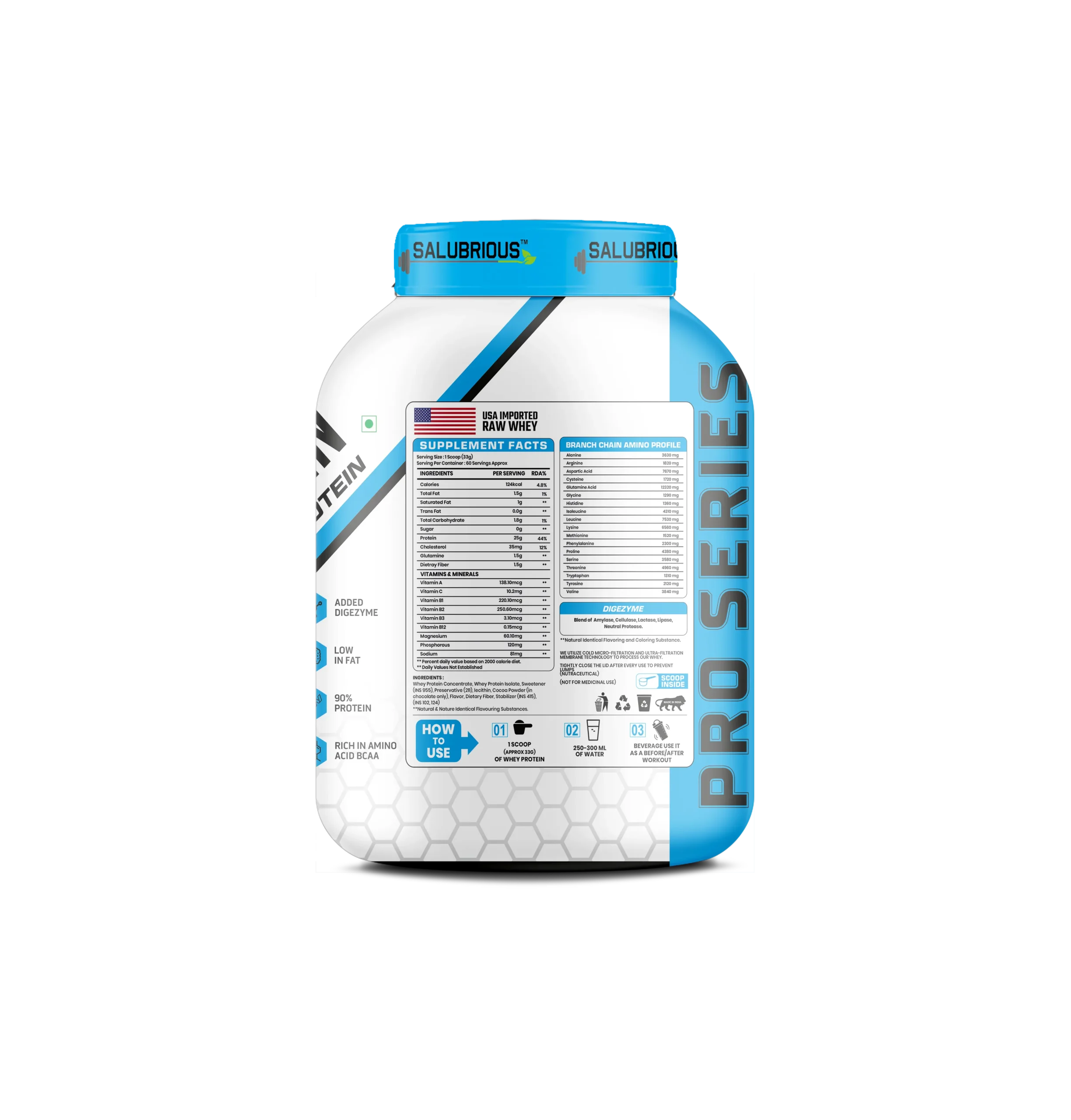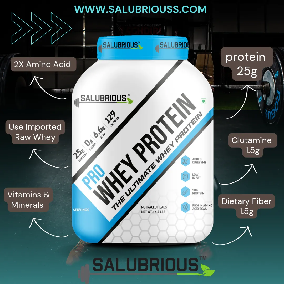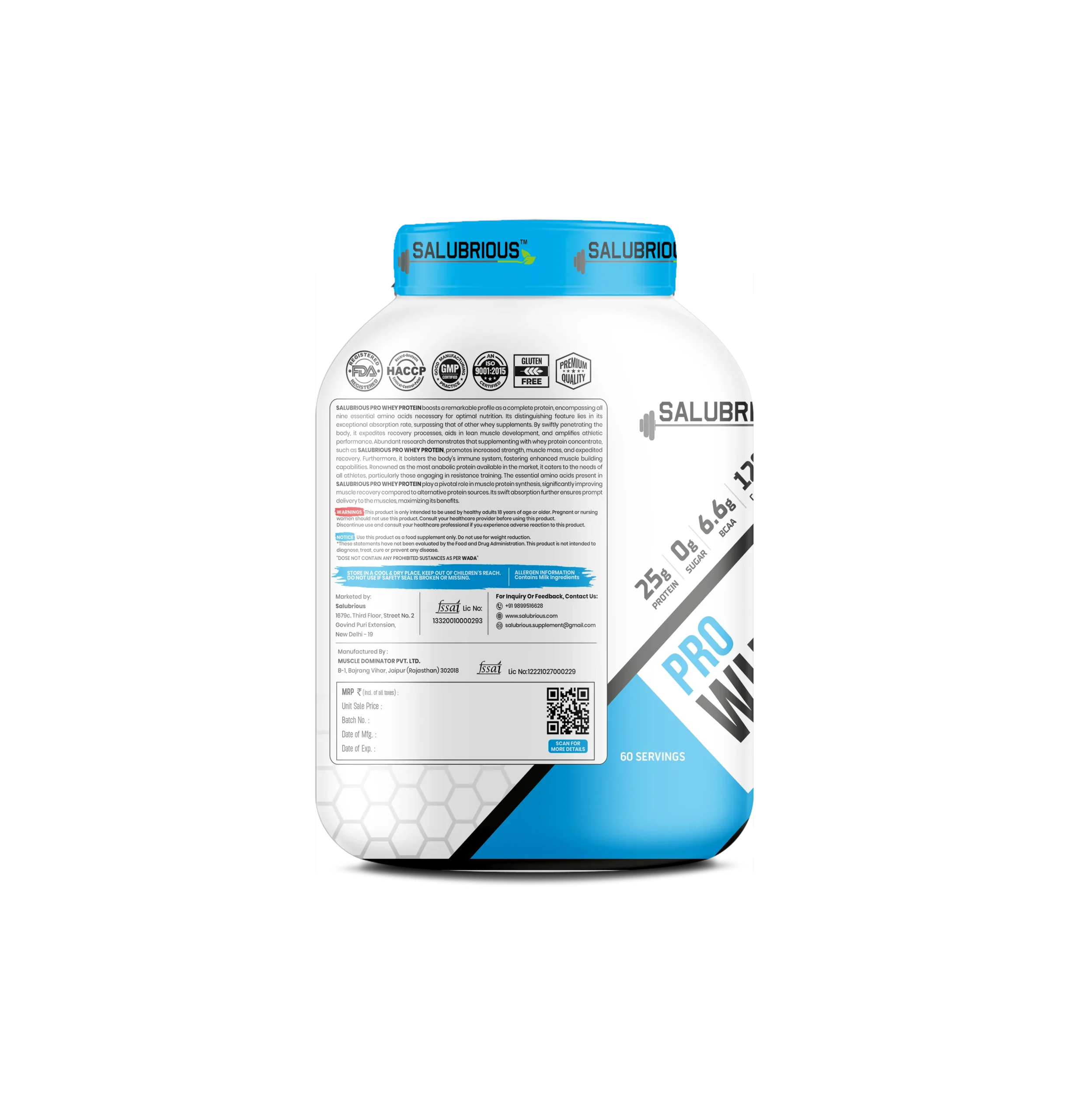 - Salubrious is a brand aimed to provide world-class health products. Having a highly trained in-house R&D team enables us to provide international quality products having premium quality ingredients sourced from the best suppliers of the world. Pro whey protein is a fast-absorbing Whey protein blend that speeds up recovery after an intense workout and helps in building lean muscles.